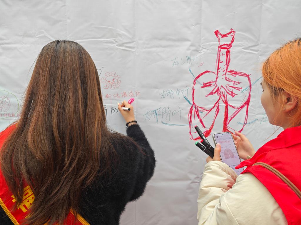 孩子們紛紛拿起畫(huà)筆,在幕布上繪制出富有創(chuàng)意的防治結(jié)核病畫(huà)作。