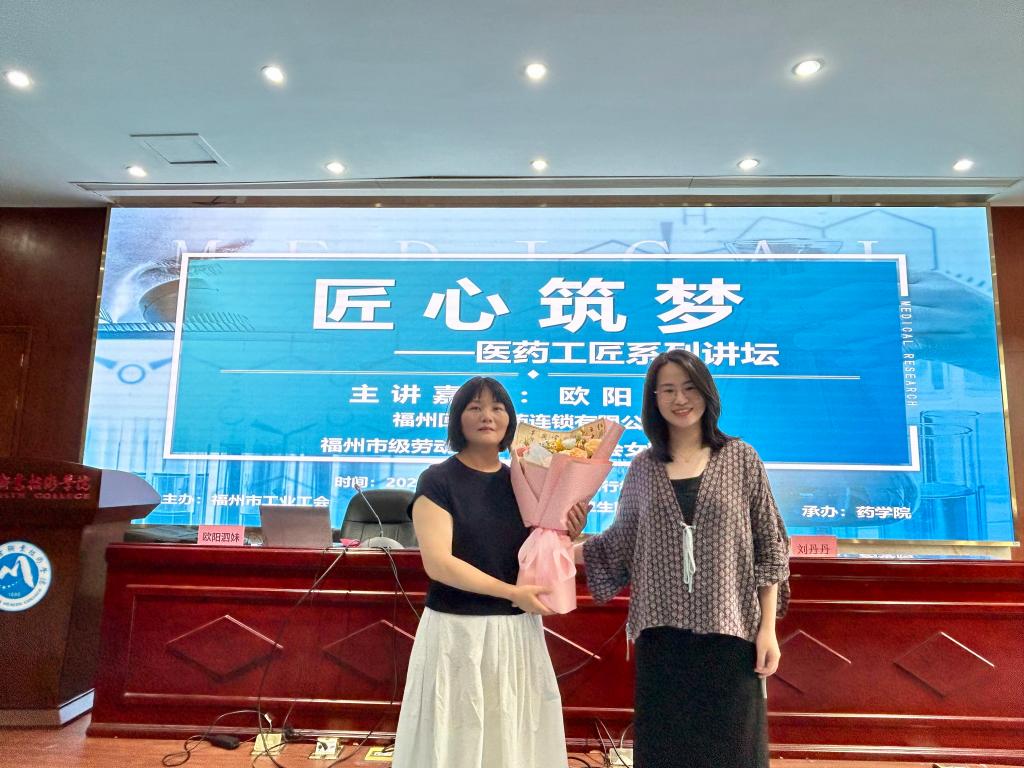 活動伊始,藥學院第二黨支部書記劉丹丹對劉鳳飛等一行的到來表示熱烈歡迎,并邀請福州市級勞動模范、全國女職工標兵歐陽泗妹帶來“弘揚勞模精神,點亮青春底色”專題分享。她以“堅定信仰、實干為本、自我驅動”為主線,講述31年一線藥品零售生涯的心得。作為福州回春醫藥連鎖公司回春國藥商場經理,她將“聽黨指揮、能打勝仗”的軍旅精神融入工作,從每日整理藥品陳列、檢查質量安全、組織員工學習的瑣碎事務中,詮釋“干一行、愛一行、精一行”的勞模精神。“藥品零售關系患者健康,容不得半分馬虎。”她強調,即使是平凡崗位,也需以“耐心恒心、精益求精”的態度守護百姓健康。