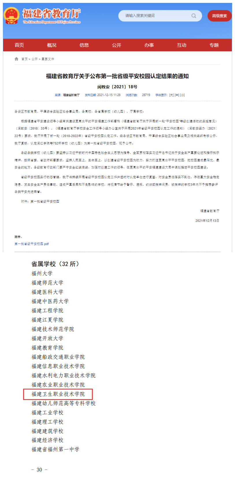 近日,福建省教育廳印發《關于公布第一批省級平安校園認定結果的通知》,我校獲評第一批“省級平安校園”。
