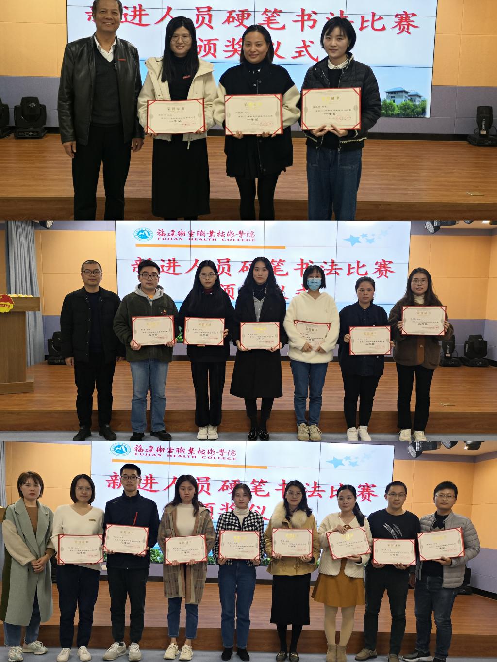 結業座談會后,主持人宣布了新進教職工硬筆書法比賽評選結果,工會專職副主席洪常青、人事處副處長張夢全、劉明珠分別為獲獎教師頒發榮譽證書。本次硬筆書法比賽,充分展現了新入職教師的風采,也激勵了廣大教師不斷夯實教學基本功。