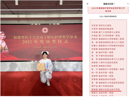5月12日,福建省紅十字會南丁格爾護理獎學基金2022年度頒獎儀式在福州舉行。大會公布了2022年度推選出的30名南丁格爾獎學金獲得者,我校護理學院2019級護理319班李淋燕同學獲此殊榮。