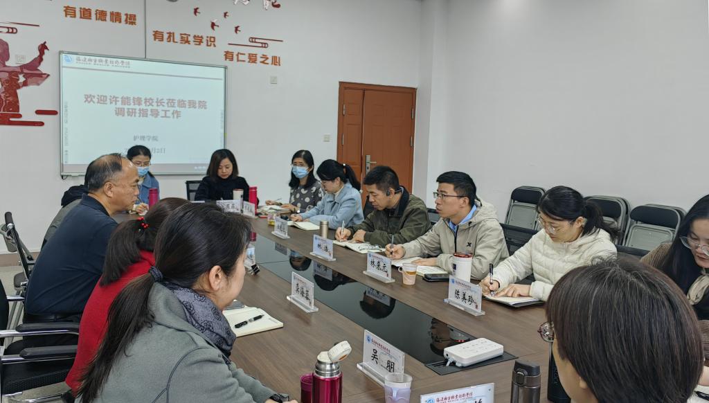 12月2日上午,校長(zhǎng)許能鋒到護(hù)理學(xué)院調(diào)研指導(dǎo)工作。黨政辦公室主任、護(hù)理學(xué)院黨政班子成員、各教研室主任參加座談會(huì)。