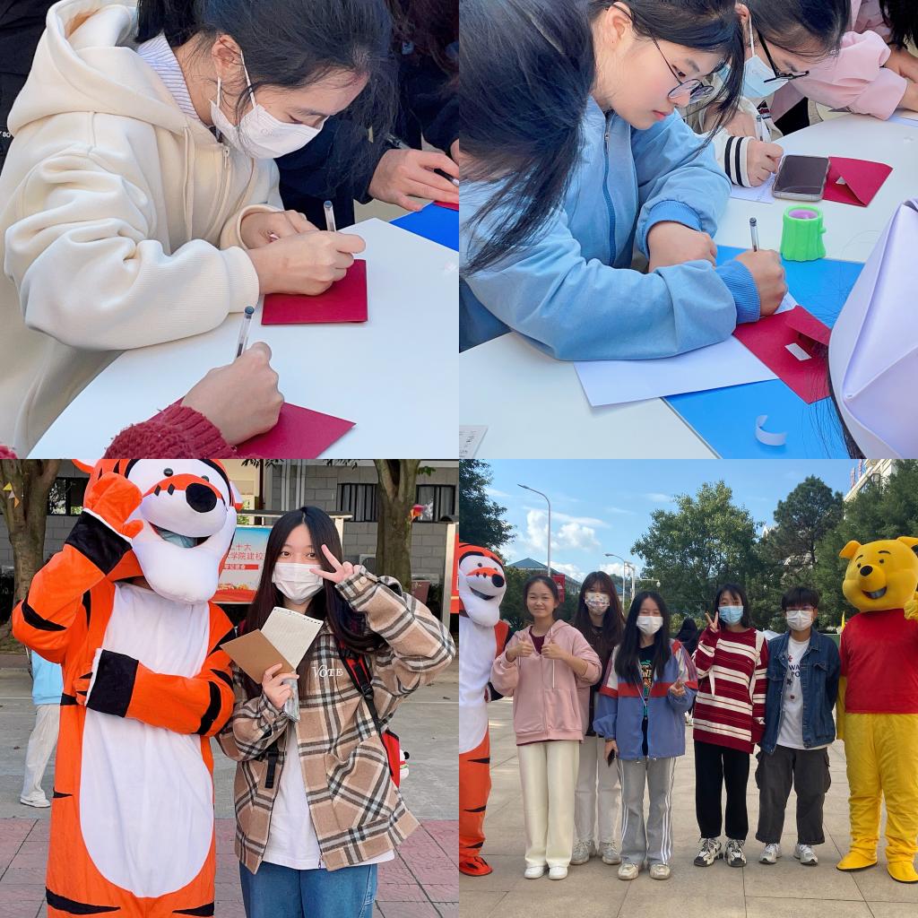 作為系列活動之一,心理健康教育中心面向全校學生舉辦了“寄語成長,共話未來”——給未來一封信活動,旨在幫助同學們規劃自己未來的道路,用現在的角度暢想未來,用未來的角度反思自己,不忘初心?;顒蝇F場還安排了可愛的人偶與同學們進行“暖心擁抱”并拍照,用溫暖的擁抱消除同學們的疲憊與煩惱。