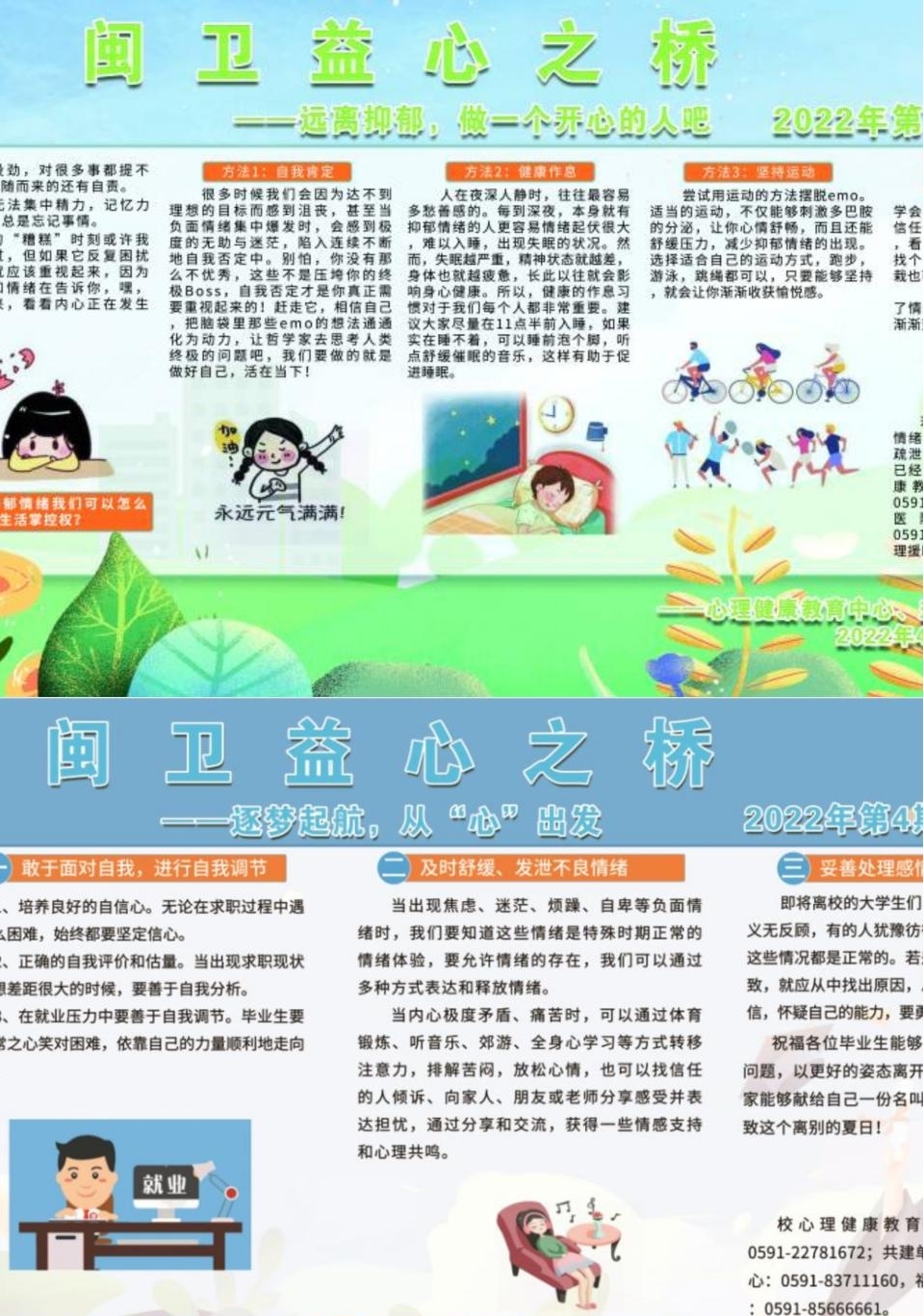 我校心理健康教育中心根據疫情防控期間學生學習、生活、工作狀態等需要,結合學生的實際心理需求,撰寫相關心理宣傳文章,每月定期更新學校心理健康教育中心宣傳欄《閩衛益心之橋》。本學期共發布《從“心”開始,向陽而生》《健康心理,快樂成長》等4期宣傳文章。同時,在閩衛院心理健康教育中心QQ《益心領讀》專欄分享心理成長類書籍,帶動身邊的人愛讀書、會讀書、有書讀,引導學生學習相關心理知識,培養閱讀養心、健心的習慣,促進學生成長成才。目前欄目已發布《好心情手冊》《內向性格的競爭力》等6篇領讀文章。