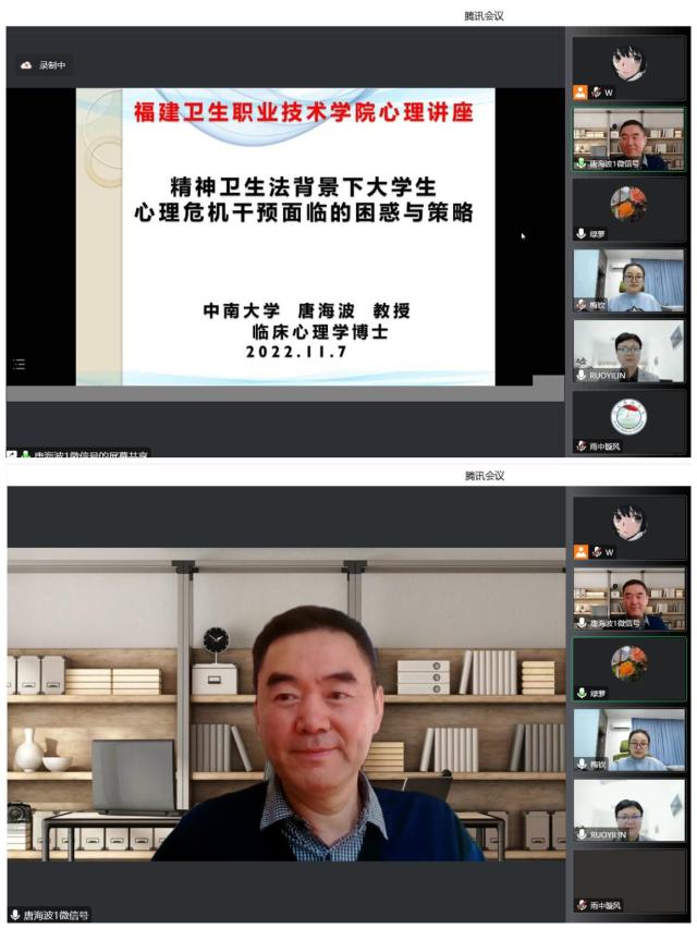 為幫助我校在疫情期間更好地開展心理危機干預工作,加強大學生心理健康教育,11月7日,我校特邀中南大學心理健康教育與咨詢專家、臨床心理學博士、中國心理學會臨床與咨詢心理學注冊心理督導師唐海波教授,面向全體輔導員、心理咨詢師及教師開展“精神衛生法背景下大學生心理危機干預策略”主題講座,與大家一起進入和探討學生的內心世界,幫助同學們走出心靈困境。