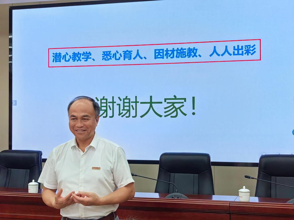他用生動的事例和自身教學工作經歷,勉勵新教師要成為新時代的“教育家”,要擁有大胸懷、大境界、大格局的“道術”,要有學科深厚、專業精湛的“學術”,要有育人水平高超,方法技術嫻熟的“技術”,要有有滋有味,有情有義的“藝術”,要有有溫度的愛,有穿透力的愛的“仁術”,并寄予新教師潛心教學、悉心育人、因材施教、人人出彩的殷切希望。