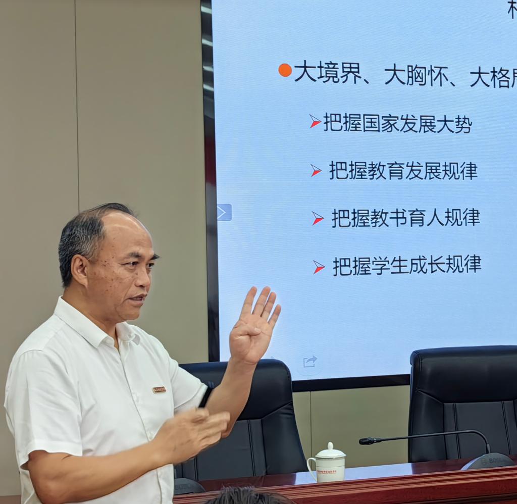8月28日,2024年度新入職教師崗前培訓開班儀式結束后,校長許能鋒以“練好五術,當好人師”為主題,為新進教師講授入職“第一課”。