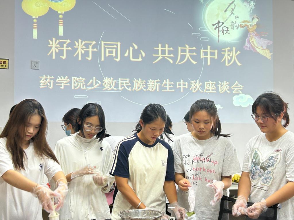 座談會前,少數民族學生同藥學院團學干部們一起制作月餅,感受指尖帶來的節日歡愉,并收獲親手制作傳統美食的欣喜。