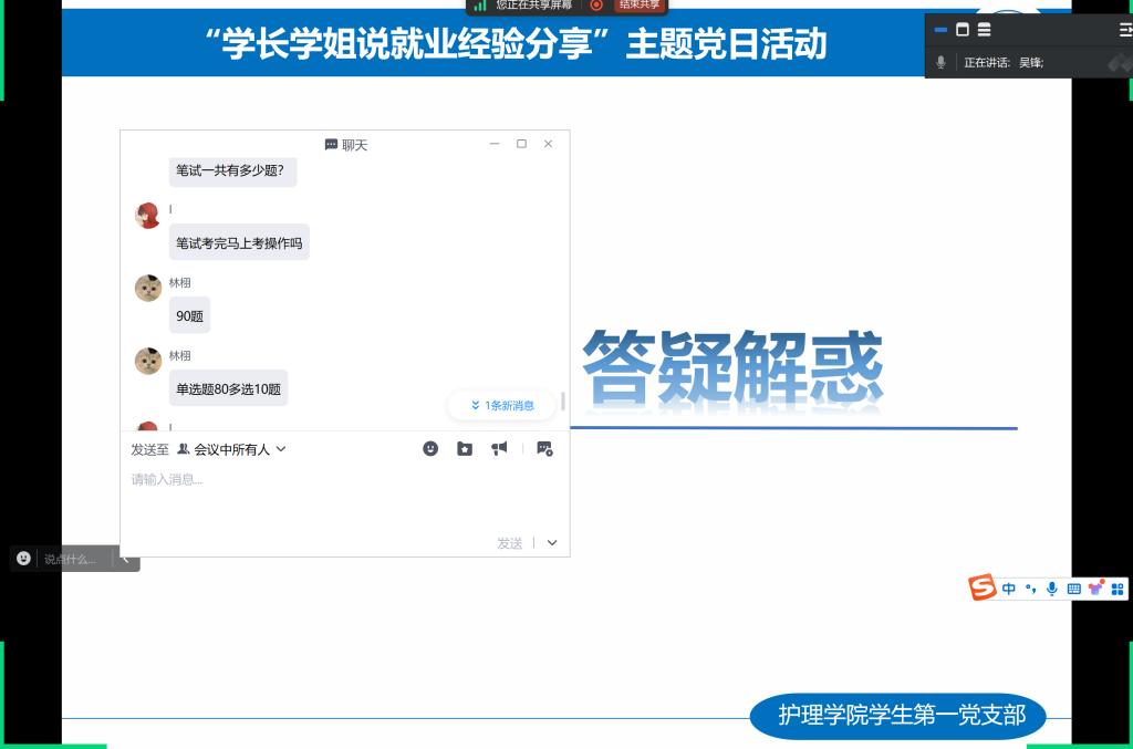 在答疑解惑環節,同學們針對附一招聘的筆試考題類型、數量及技能操作考核細節提出問題,兩位校友為學弟學妹們一一作了耐心詳細的解答。
