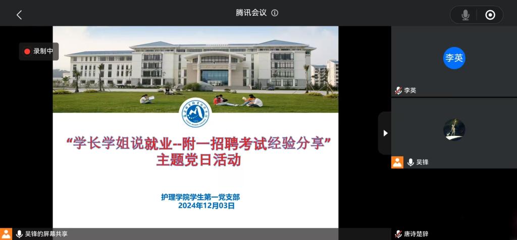 為深入貫徹落實黨的二十屆三中全會精神和習近平總書記關于促進高質量充分就業的重要講話精神,12月3日,護理學院學生第一黨支部開展“學長學姐說就業——附一專場招聘考試經驗交流分享”主題黨日活動。本次促就業分享會邀請就職于福建醫科大學附屬第一醫院的2024屆畢業生李涵和林栩,為即將參加招聘考試的2025屆畢業生提供實用的求職技巧和經驗,提高就業競爭力。