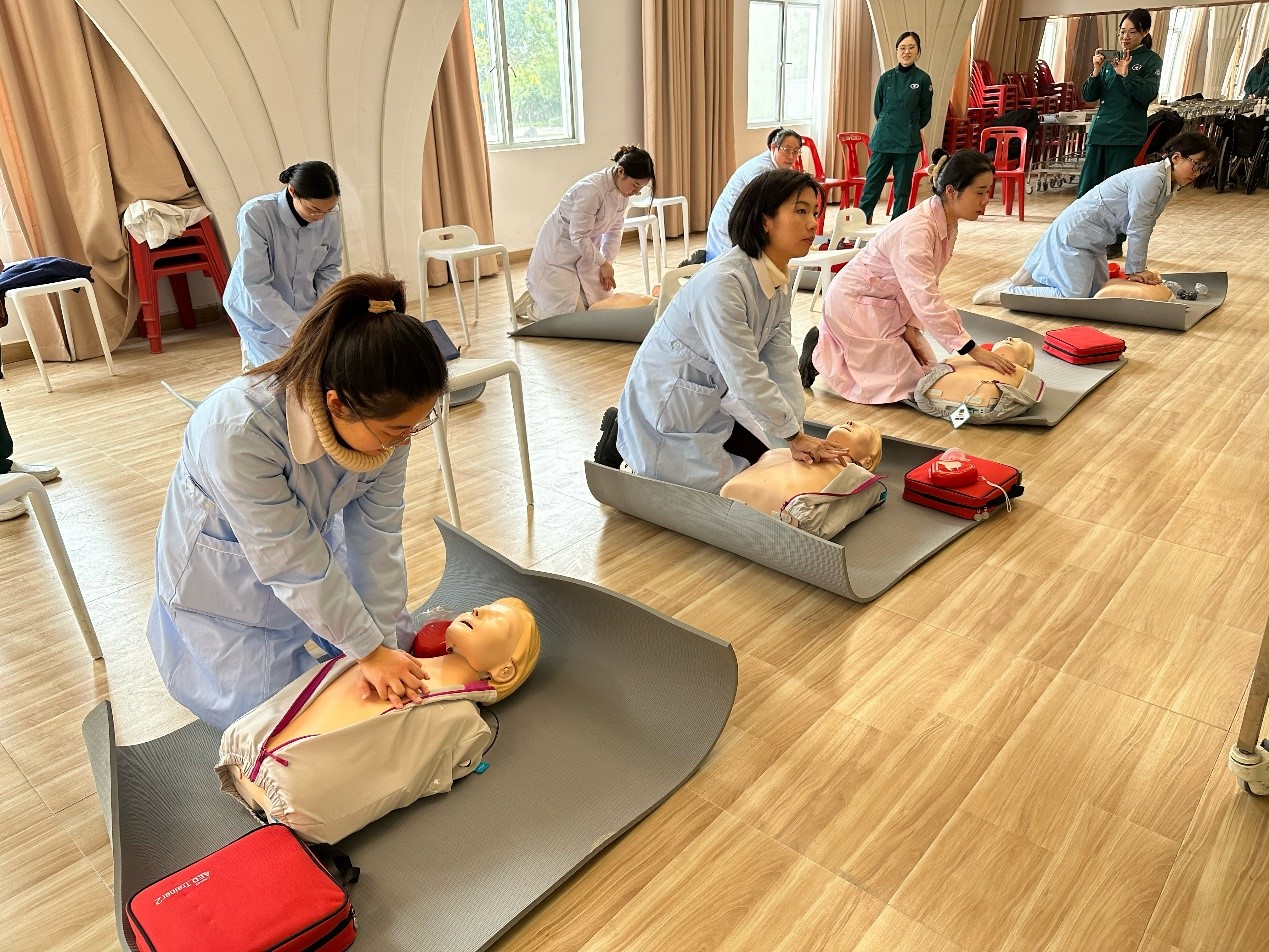 此次培訓活動以我院美國心臟協會(AHA)培訓中心為主導,面向護理學院青年教師開展普及現場心肺復蘇急救技術的培訓。AHA是全球心血管領域最權威的專業組織之一。長期致力于全球范圍內培訓,旨在推廣心肺復蘇(CPR)技術在專業醫療救護人員與公眾的普及。導師們通過視頻教學、現場模擬、交流互動等方式,精準指導學員領會每一個細節動作。參訓人員依次有序進行技能培訓,導師們手把手地教,學員一絲不茍認真地學。最終,所有學員均通過理論和技能考試。