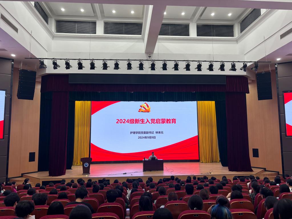 為深入學習貫徹習近平新時代中國特色社會主義思想和黨的二十屆三中全會精神,深化理想信念教育,激發愛黨愛國熱情,引導青年大學生堅定不移聽黨話、跟黨走,護理學院黨委于9月9日晚在崇學廳開展2024級新生入黨啟蒙暨黨史學習教育專題黨課。此次黨課由學院黨委副書記林來元主講。