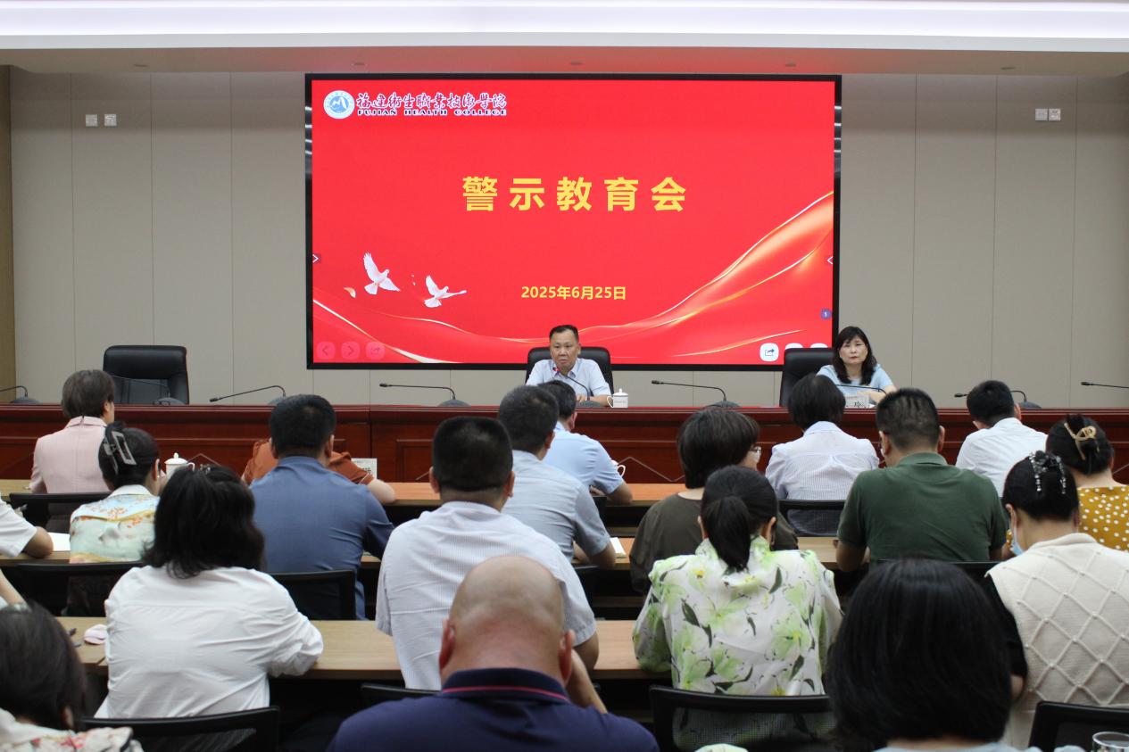6月25日,學(xué)校召開警示教育會(huì),深入學(xué)習(xí)貫徹習(xí)近平總書記關(guān)于加強(qiáng)黨的作風(fēng)建設(shè)的重要論述和中央八項(xiàng)規(guī)定及其實(shí)施細(xì)則精神,進(jìn)一步強(qiáng)化以案為鑒、以案明紀(jì)、以案促改,推動(dòng)深入貫徹中央八項(xiàng)規(guī)定精神學(xué)習(xí)教育走深走實(shí)。校黨委書記曾武祈主持會(huì)議并講話。