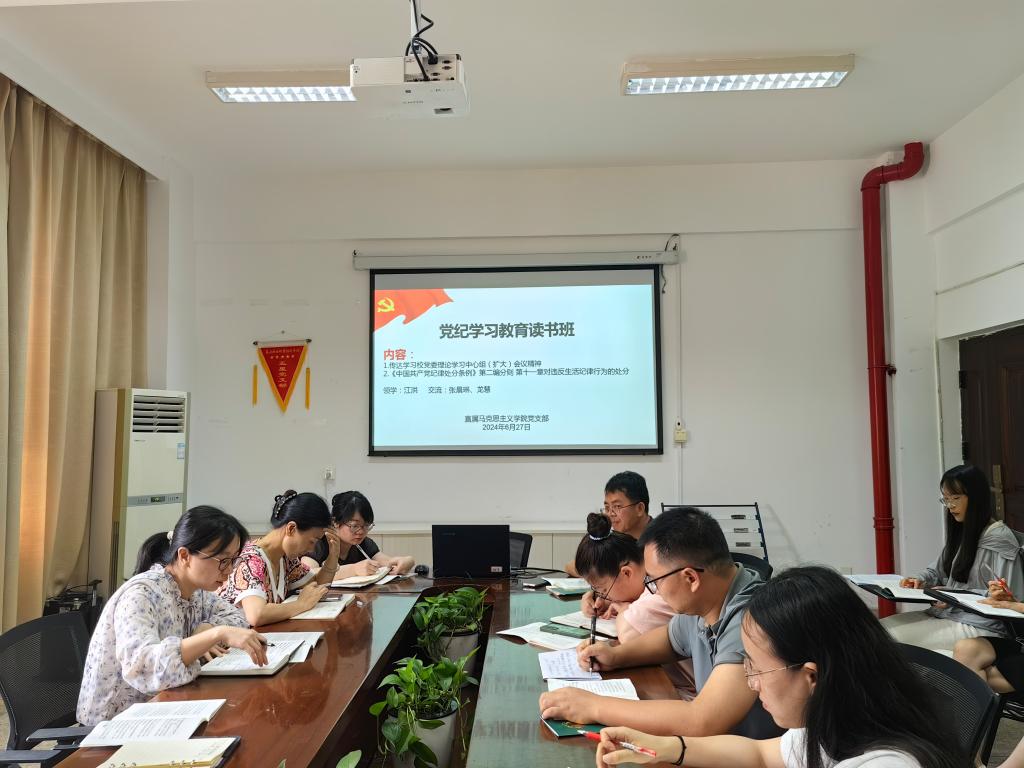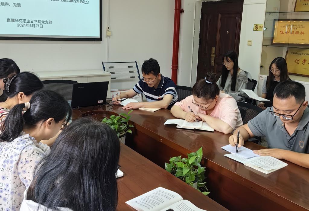 生活紀律是黨員在日常生活和社會交往中應當遵守的行為規則,其本質要求是踐行社會主義核心價值觀,明大德、守公德、嚴私德。2024年6月27日,馬克思主義學院黨總支黨紀學習教育讀書班在厚德樓107會議室圍繞《中國共產黨紀律處分條例》開展第七次集體學習活動。