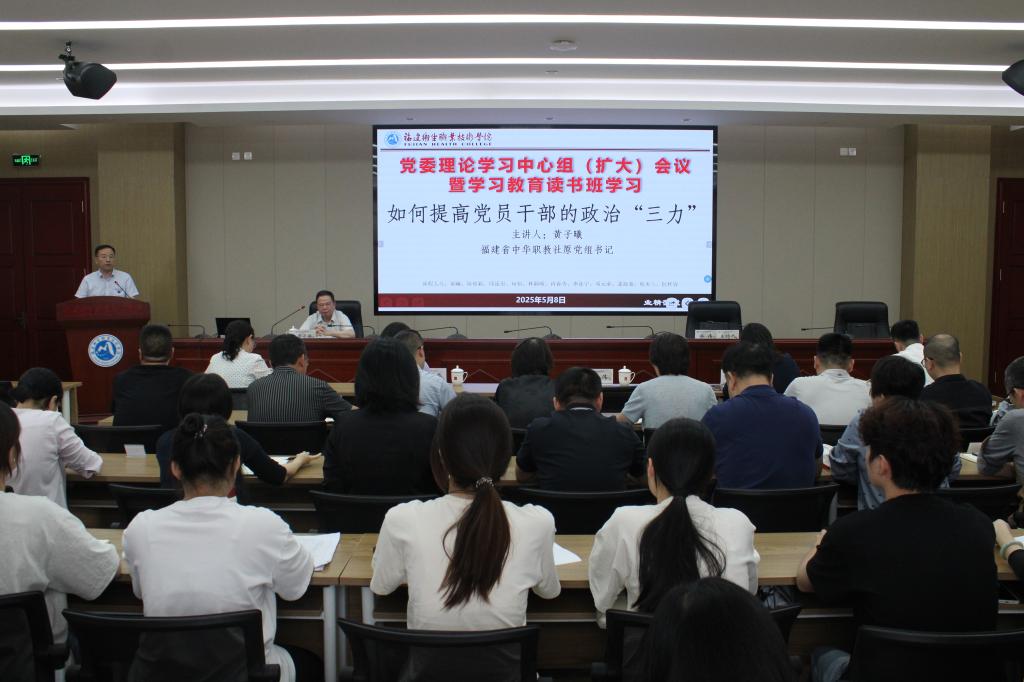 5月8日,我校召開黨委理論學(xué)習(xí)中心組(擴(kuò)大)會(huì)議暨學(xué)習(xí)教育讀書班學(xué)習(xí),邀請(qǐng)福建省中華職教社原黨組書記黃子曦教授為校領(lǐng)導(dǎo)、全體中層正職(含主持工作)、青馬工程班學(xué)員帶來《如何提高黨員干部的“政治三力”》專題講座。此次學(xué)習(xí)既是對(duì)黨員干部政治素養(yǎng)的深度錘煉,也是為青馬工程班學(xué)員筑牢信仰根基的重要一課。