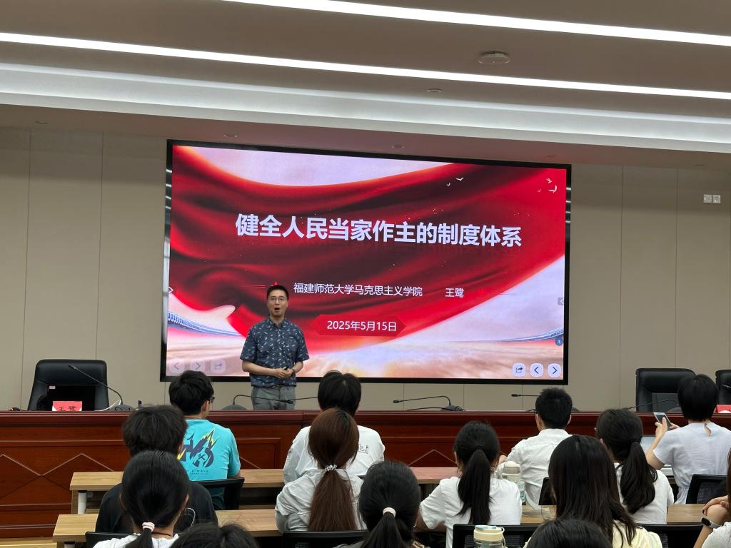 為深入貫徹落實黨的二十大和二十屆三中全會精神,推動新時代思想政治理論課改革創新,提升全校師生對中國特色社會主義制度體系的理解,5月15日,我校邀請福建師范大學馬克思主義學院副教授王鷺在厚德樓六樓會議室作題為《健全人民當家作主的制度體系》專題講座。講座由馬克思主義學院黨總支副書記賴文金主持,馬克思主義學院全體專兼職教師、學生代表參加。
