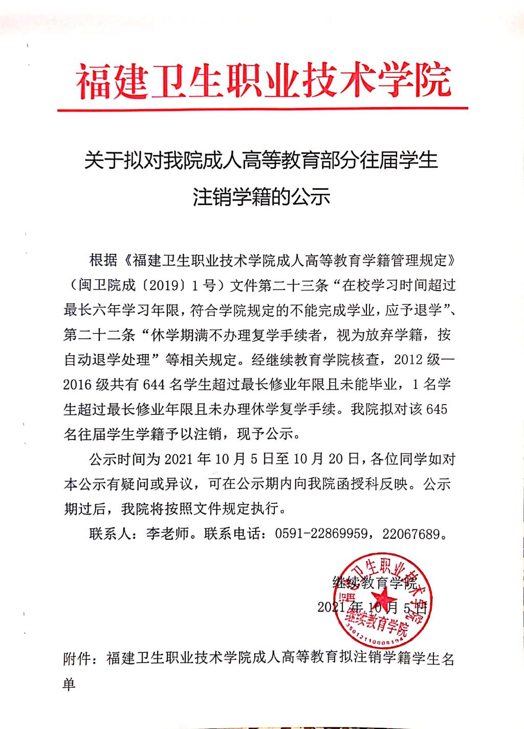 關于擬對我院成人高等教育部分往屆學生注銷學籍的公示