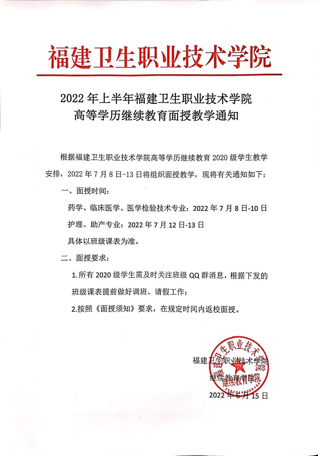 2022年上半年福建衛生職業技術學院 高等學歷繼續教育面授教學通知