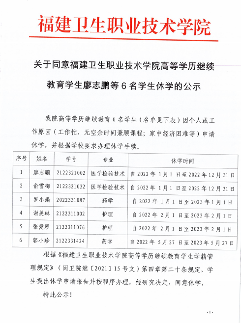 關于同意福建衛生職業技術學院高等學歷繼續教育學生廖志鵬等6名學生休學的公示