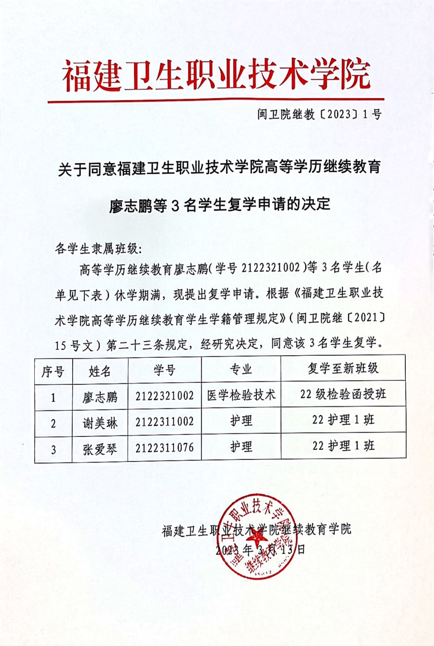 關于同意福建衛生職業技術學院高等學歷繼續教育廖志鵬等3名學生復學申請的決定