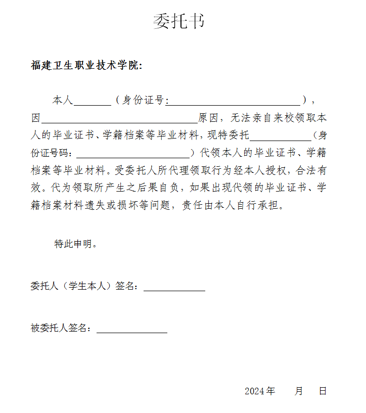 請學生本人攜帶身份證原件在規定時間到校領取畢業證及檔案。若是本人因特殊情況無法到校領取需委托親屬代領的,代領時請攜帶委托書、委托人和被委托人的身份證原件和復印件(委托書和復印件提交留存)。