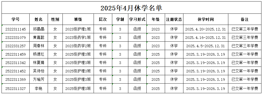 關(guān)于高等學(xué)歷繼續(xù)教育學(xué)生鄭晶晶、黃嘉懿等8名學(xué)生休學(xué)的公示