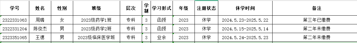 根據《福建衛生職業技術學院高等學歷繼續教育學生學籍管理規定》(閩衛院繼〔2025〕2號)中“學生休學原則上以一年為期。學生休學期間,保留學籍”;“學生休學期滿,應于學年或學期前一個月向學校申請復學”。周璐等3名學生即將休學期滿(名單詳見附件),應于2025年5月22日前復學,并按流程辦理復學審批手續。