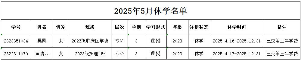 吳鳳、黃倩云等2名高等學歷繼續(xù)教育學生因產(chǎn)后哺乳期,不方便上課等原因,申請休學。根據(jù)《福建衛(wèi)生職業(yè)技術(shù)學院高等學歷繼續(xù)教育學生學籍管理規(guī)定》(閩衛(wèi)院繼〔2025〕2號文)第六章第三十四條的有關規(guī)定,經(jīng)研究,擬同意吳鳳、黃倩云等2名高等學歷繼續(xù)教育學生休學,按照流程辦理。