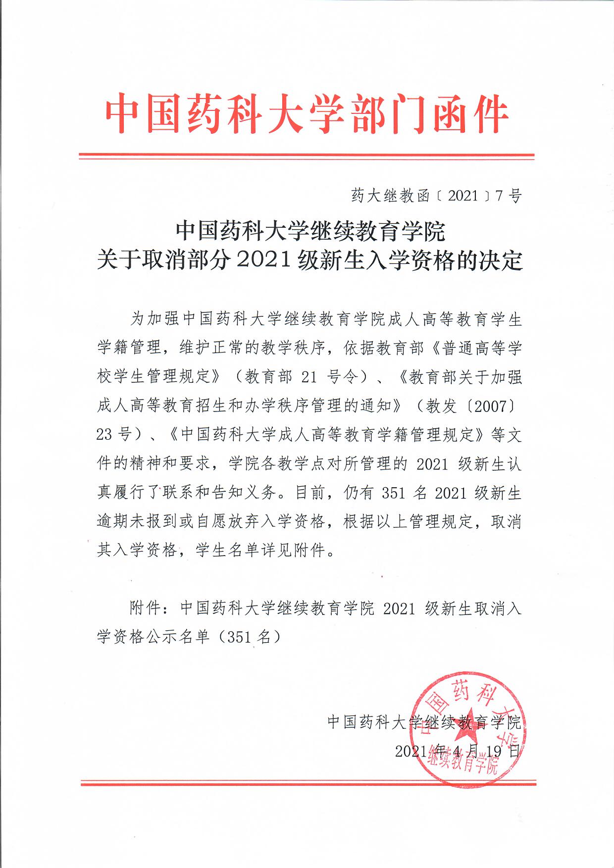中國藥科大學繼續教育學院關于取消部分2021級新生入學資格的決定,其中含福建函授站1人,具體名單見附件。