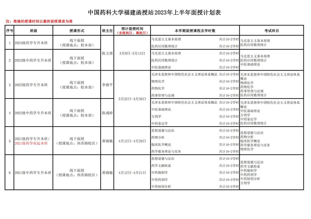 中國藥科大學福建函授站2023年上半年面授計劃表(專升本/2021級高起本)
