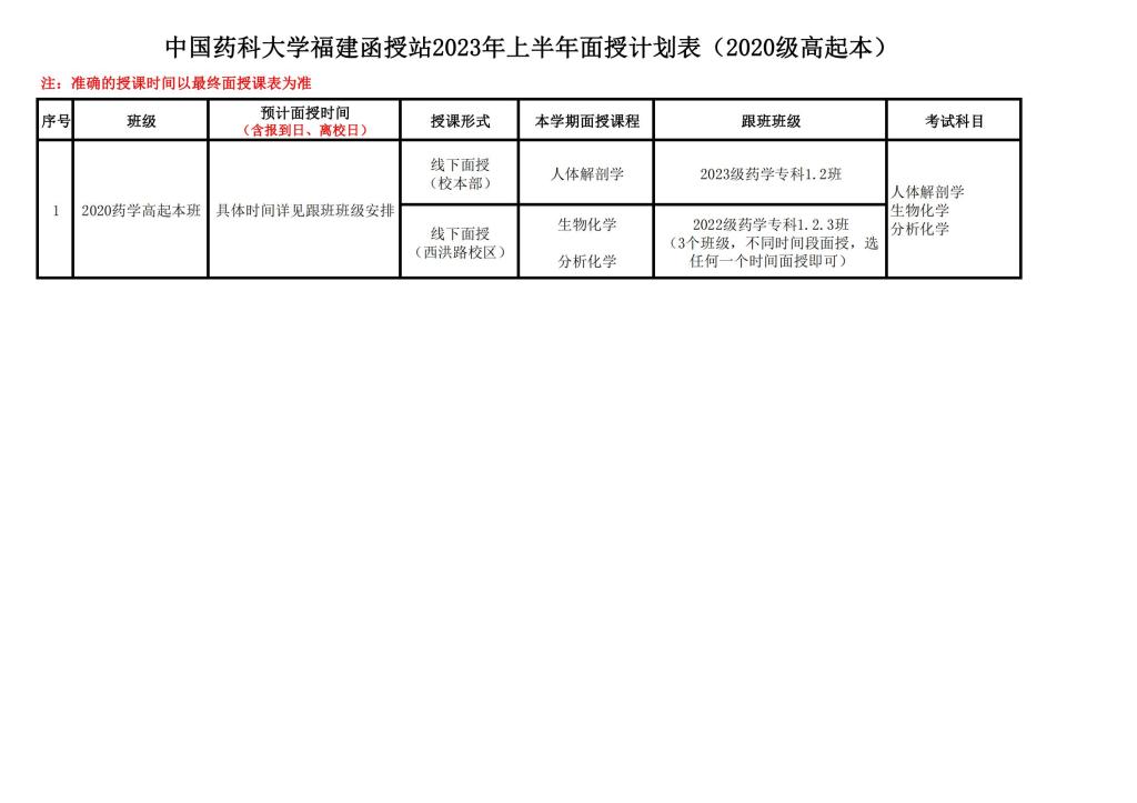 中國藥科大學福建函授站2023年上半年面授計劃表(2020級高起本)