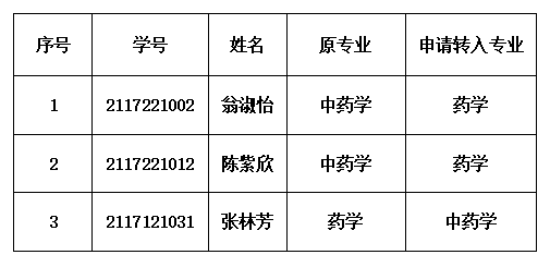 根據(jù)中國藥科大學(xué)繼續(xù)教育學(xué)院相關(guān)管理規(guī)定,2021級(jí)翁淑怡等3人因個(gè)人工作需要等原因,提出轉(zhuǎn)專業(yè)申請(qǐng),經(jīng)班主任審核,我站研究審議,該3名學(xué)生符合轉(zhuǎn)專業(yè)條件,同意轉(zhuǎn)專業(yè),并上報(bào)中國藥科大學(xué)繼續(xù)教育學(xué)院審批。 現(xiàn)將轉(zhuǎn)專業(yè)名單予以公示,公示期12月20日至12月24日,如有異議,請(qǐng)以書面形式在公示期內(nèi)向我站反饋。聯(lián)系電話:0591-22869959
