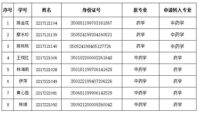 根據(jù)中國藥科大學(xué)繼續(xù)教育學(xué)院相關(guān)管理規(guī)定,2022級(jí)陳金花等8人因個(gè)人工作需要等原因,提出轉(zhuǎn)專業(yè)申請(qǐng),經(jīng)班主任審核,我站研究審議,該3名學(xué)生符合轉(zhuǎn)專業(yè)條件,同意轉(zhuǎn)專業(yè),并上報(bào)中國藥科大學(xué)繼續(xù)教育學(xué)院審批。 現(xiàn)將轉(zhuǎn)專業(yè)名單予以公示,公示期12月19日至12月23日,如有異議,請(qǐng)以書面形式在公示期內(nèi)向我站反饋。聯(lián)系電話:0591-22869959