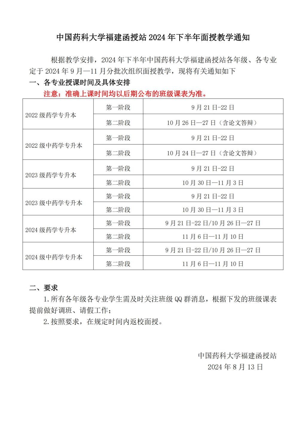 中國藥科大學福建函授站2024年下半年面授教學通知