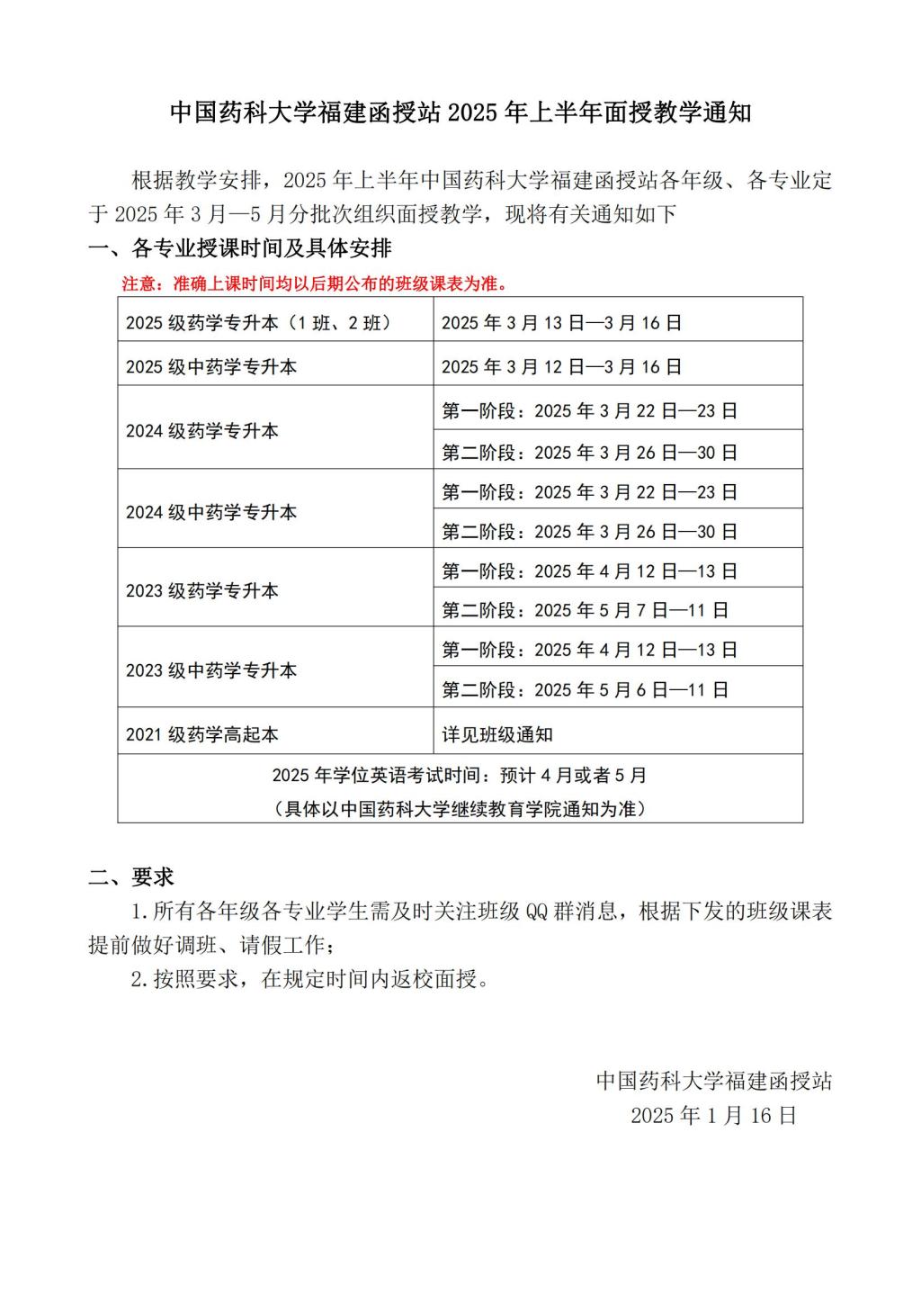 中國藥科大學福建函授站2025年上半年面授教學通知