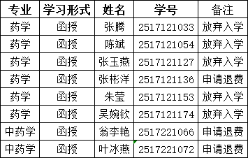 經(jīng)班主任聯(lián)系確認(rèn)、函授站核查, 中國藥科大學(xué)高等學(xué)歷繼續(xù)教育2025級張騰等8名新生逾期未繳費或申請退費、未辦理入學(xué)手續(xù),現(xiàn)將相關(guān)情況予以公示。