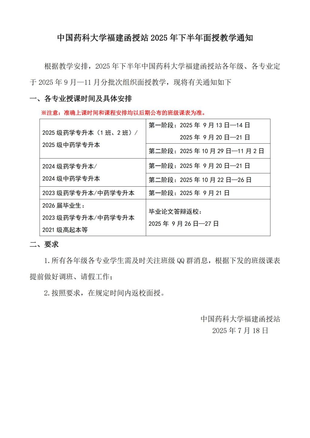 中國(guó)藥科大學(xué)福建函授站2025年下半年面授教學(xué)通知