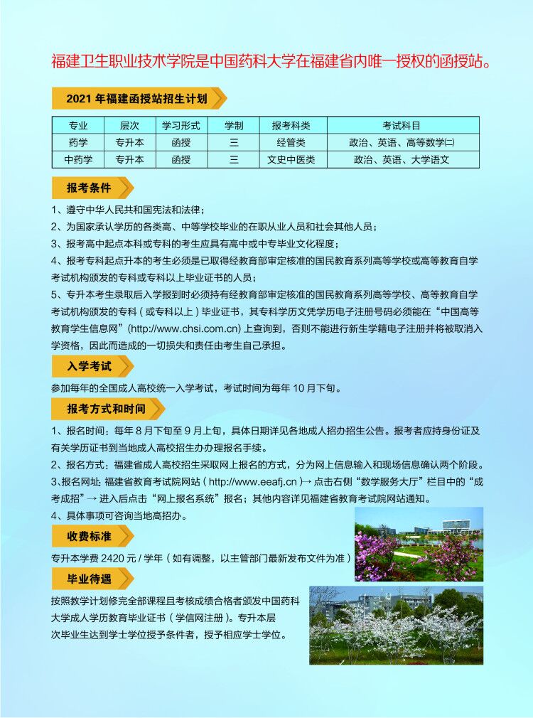 2021年中國藥科大學高等學歷繼續教育福建函授站招生簡章