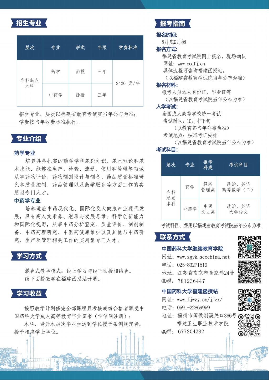 2024年中國藥科大學高等學歷繼續教育福建函授站招生簡章