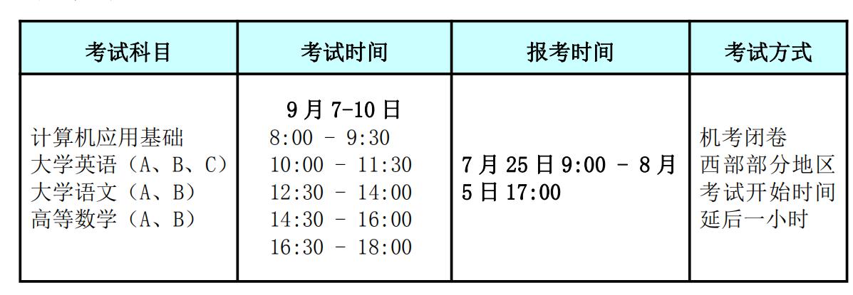 (1)《計算機應用基礎》、《大學英語》B兩門統考課程全部采用混編考場方式。報考時間如下: