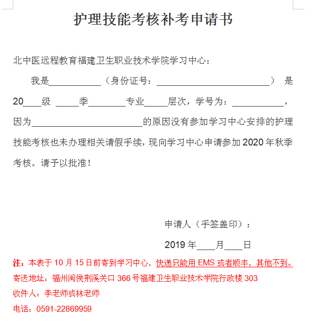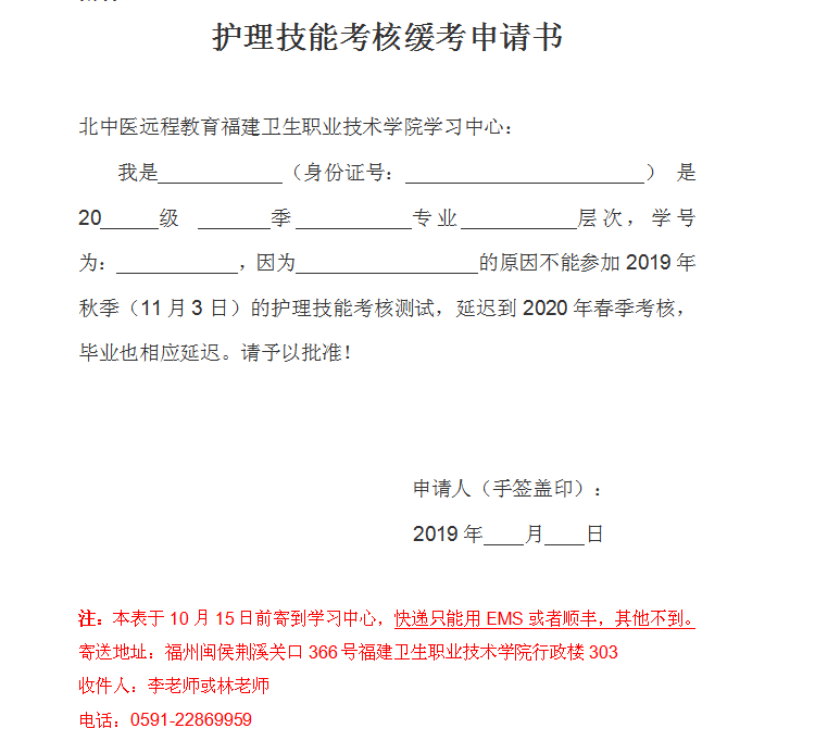 3.請各位學生做好調班請假手續(緩考申請詳見附件3)。若有特殊情況(如懷孕、坐月子、生病等)不能參加護理技能測試的,請于10月15日前向學習中心提交書面緩考申請延遲到2020年春季測試,畢業時間相應延遲。為有效利用考試資源,之前無故缺考的考生需提前提交補考申請方可參加本次考核(補考申請詳見附件4)。