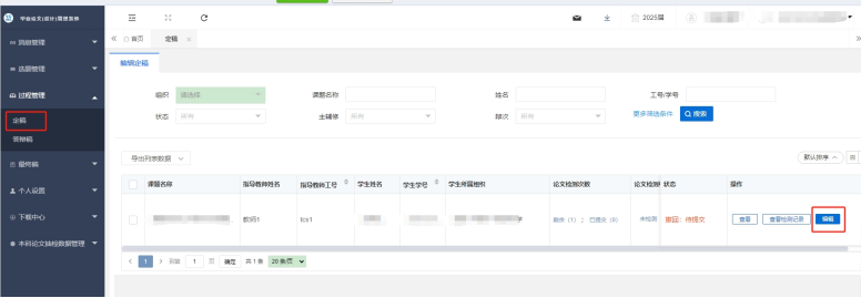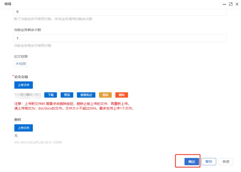 方式二:在點(diǎn)擊左側(cè)“過(guò)程管理”-“定稿”,點(diǎn)擊“編輯”,上傳論文。上傳完成后點(diǎn)擊“確定”完成提交。