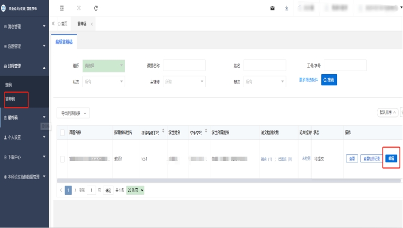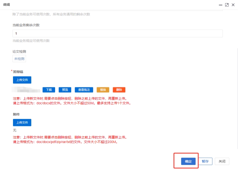 方式二:在點(diǎn)擊左側(cè)“過(guò)程管理”-“答辯稿”,點(diǎn)擊“編輯”,上傳論文。上傳完成后點(diǎn)擊“確定”完成提交。