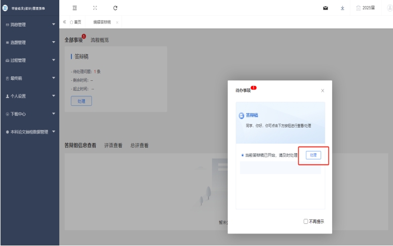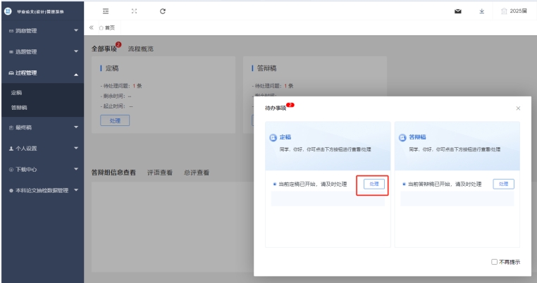 方式一:通過(guò)彈出的“待辦事項(xiàng)”提示框點(diǎn)擊“處理”進(jìn)入,上傳論文。上傳完成后點(diǎn)擊“確定”完成提交。