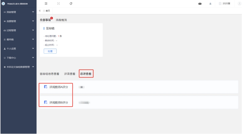 登錄論文系統(tǒng),在首頁(yè)-“總評(píng)查看”中可查看成績(jī),點(diǎn)擊“評(píng)閱教師A評(píng)分”、 “評(píng)閱教師B評(píng)分”可分別查看評(píng)閱意見(jiàn)。