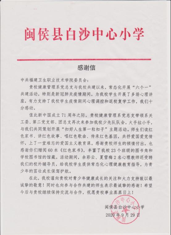 近日,白沙中心小學向我校發(fā)來感謝信,感謝健康管理系黨總支與他們常態(tài)化開展“六個一”共建活動,特別是新冠肺炎疫情期間,給學校提供的心理健康服務支持及國慶前夕給學生們帶來的愛國主義教育課。