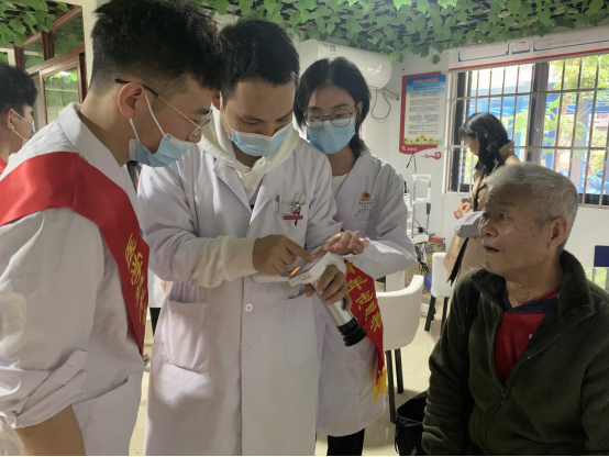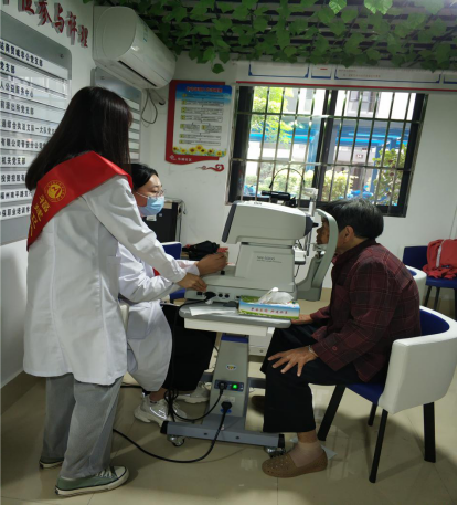 眼部疾病檢查,愛眼護眼在行動。眼視光技術專業的師生攜帶裂隙燈顯微鏡、非接觸性眼壓計、眼底照相機等專業設備,為社區居民開展眼部健康、眼前節及眼底等檢查,篩查年齡相關性白內障和糖尿病視網膜病變。對義診中篩查出的眼部健康問題,師生們耐心指導社區居民愛眼護眼的方法,引導特殊情況及時就醫。