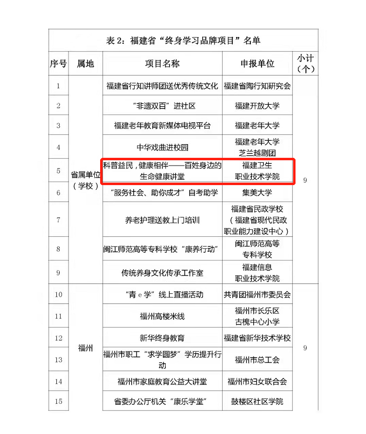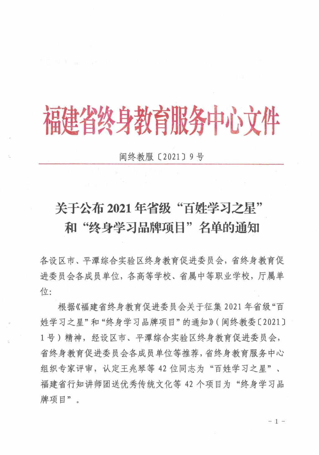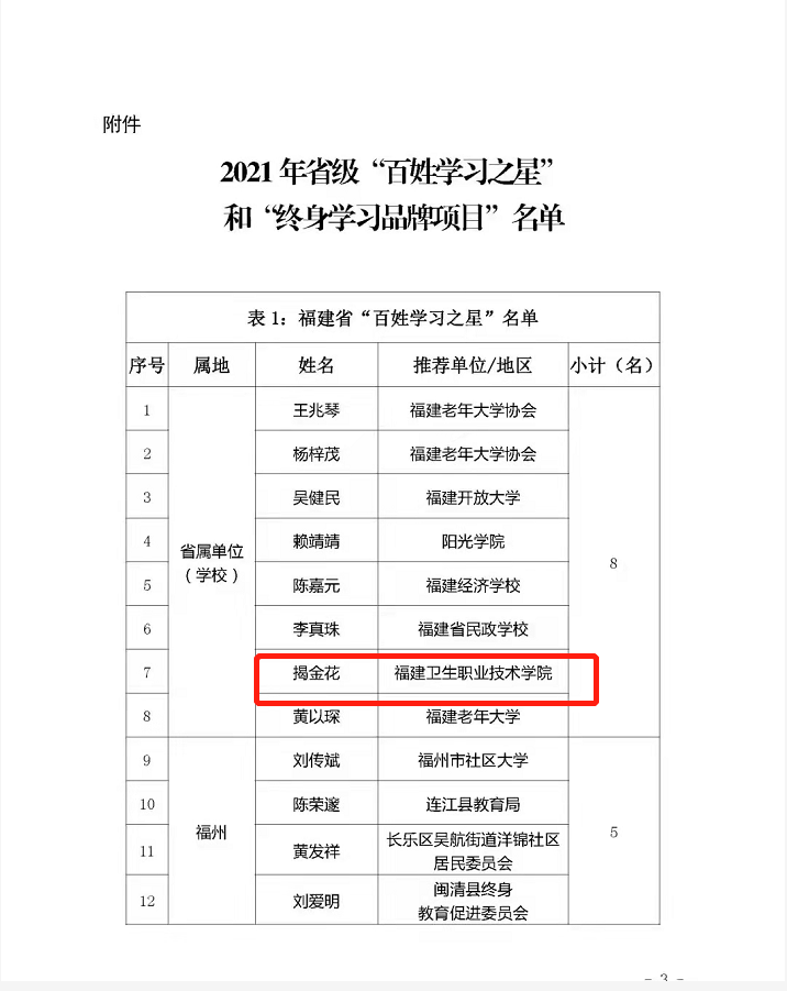 近日,根據文件《關于公布2021年省級“百姓學習之星” 和“終身學習品牌項目”名單的通知》閩終教服[2021]9號,我校健康管理系揭金花老師認定為2021年省級“百姓學習之星”;醫學基礎部項目“科普益民,健康相伴——百姓身邊的生命健康講堂”認定為2021年省級“終身學習品牌項目”。特此祝賀!