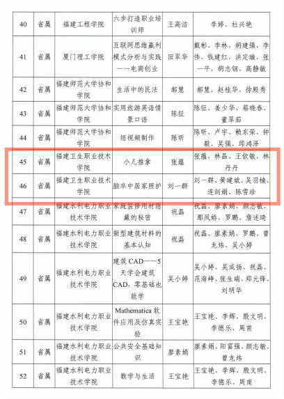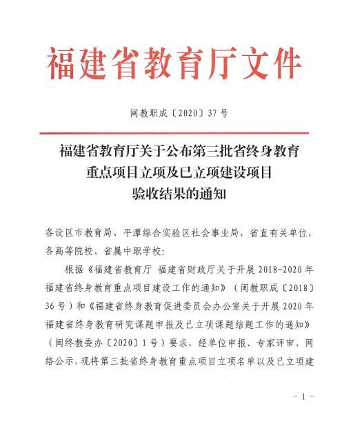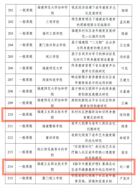 近日,根據(jù)《福建省教育廳關(guān)于公布第三批省終身教育重點(diǎn)項(xiàng)目立項(xiàng)及立項(xiàng)建設(shè)項(xiàng)目驗(yàn)收結(jié)果的通知》(閩教職成〔2020〕37號),我校老年大學(xué)項(xiàng)目獲批《福建省高校老年大學(xué)建設(shè)項(xiàng)目》;醫(yī)學(xué)系張?zhí)N老師主持的《小兒推拿》項(xiàng)目、護(hù)理學(xué)院劉一群老師主持的《腦卒中居家照護(hù)》項(xiàng)目入選省級繼續(xù)教育網(wǎng)絡(luò)課程;連劍娟老師主持的《農(nóng)村社區(qū)腫瘤防治知識終身教育模式的研究》項(xiàng)目、劉一群老師主持的《腦卒中康復(fù)護(hù)理》慕課在社區(qū)老年健康教育中的應(yīng)用研究項(xiàng)目入選終身教育研究課題。特此祝賀!
