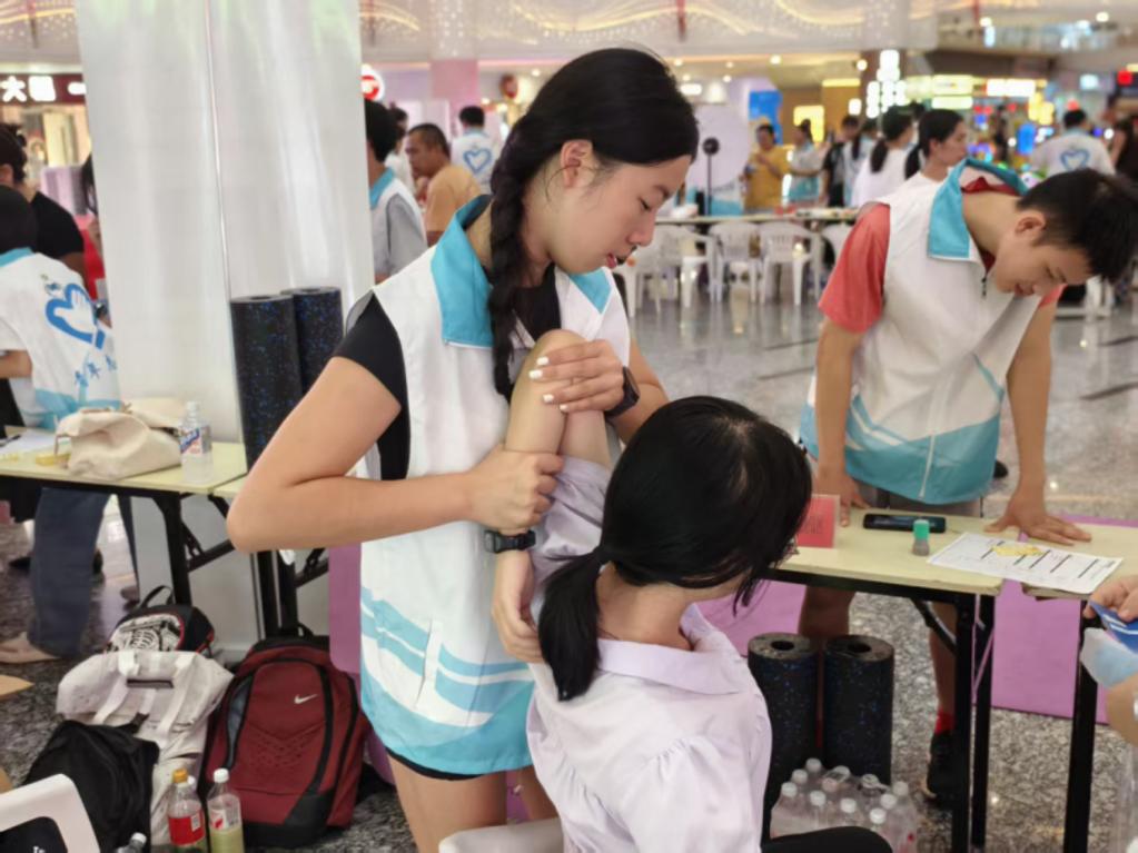 活力無限健康挑戰(zhàn)區(qū),體育保健組以PNF拉伸為主題,演示“收縮-放松”原理,幫市民緩解肌肉緊張。